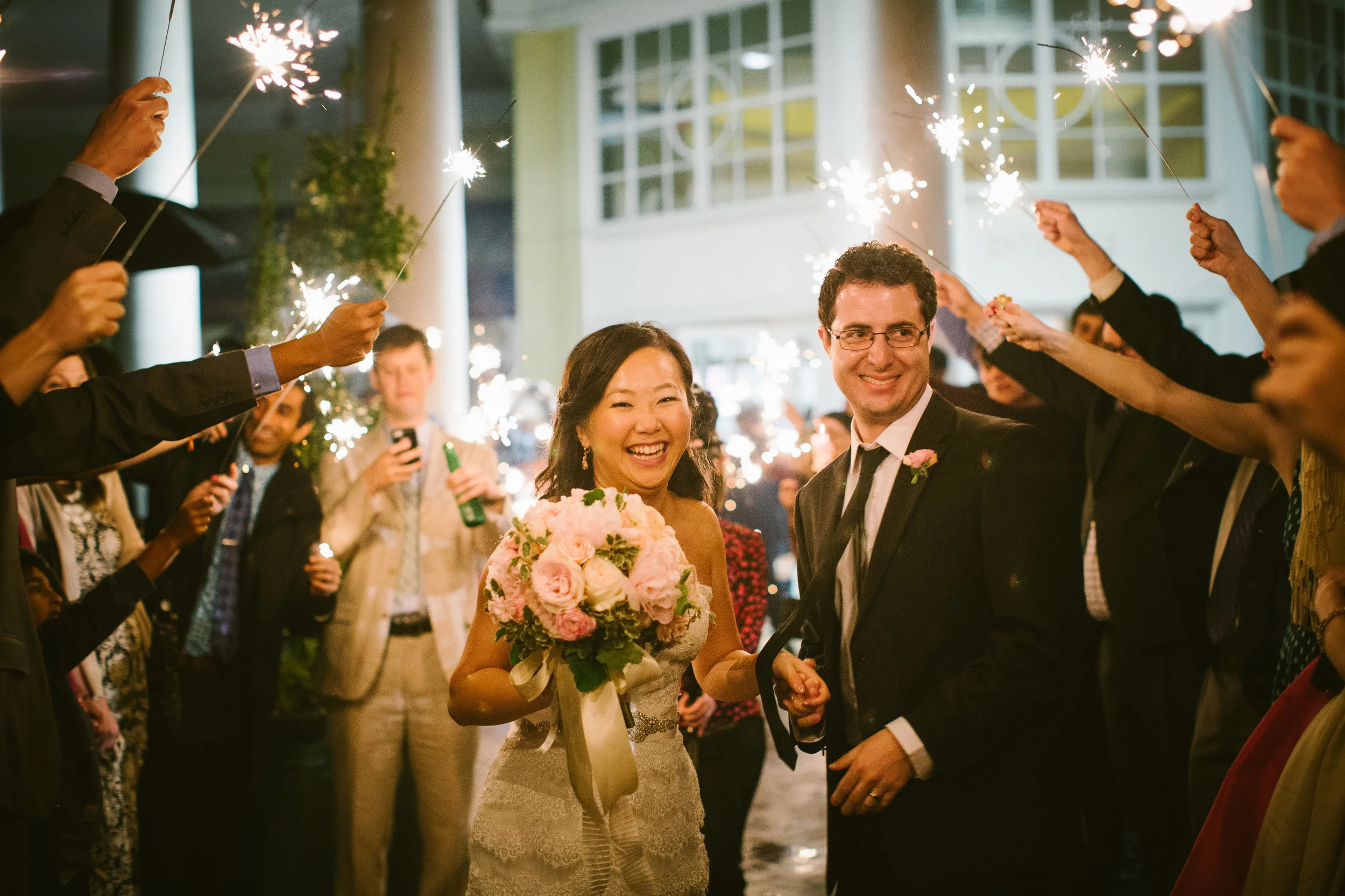 With classic and elegant style in mind, we used a neutral color palette of navy blue, cream and gold, with a few sparkly touches. The soft details and clean lines were perfect for their modern venue, The Mint Museum Uptown. Brittani's style is effortless, and she wanted to create a day that reflected her personal style. So we focused our design around the fun party atmosphere by adding in lounge furniture for alternative guest seating, where they could enjoy the heavy hors d'oeuvres menu and fabulous live band. The caterer passed around late night snacks like grill cheese - a favorite of the bride and groom - and chicken fingers with fries as the guests partied into the night at one of Charlotte's premier venues. And with a grand streamer exit, the happy couple hopped into a pedicab at the end of the night.